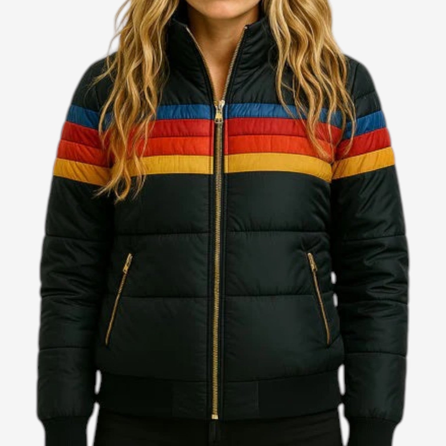 Vivace e accogliente, questo piumino aggiunge un tocco di allegria allo stile invernale. Le sue audaci righe color-block evocano un fascino retrò, mentre il design imbottito garantisce calore e comfort duraturi. Perfetto per le mattine frizzanti o le passeggiate in città, coniuga praticità e un tocco giovanile e vivace.