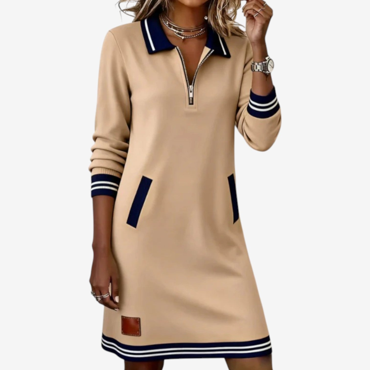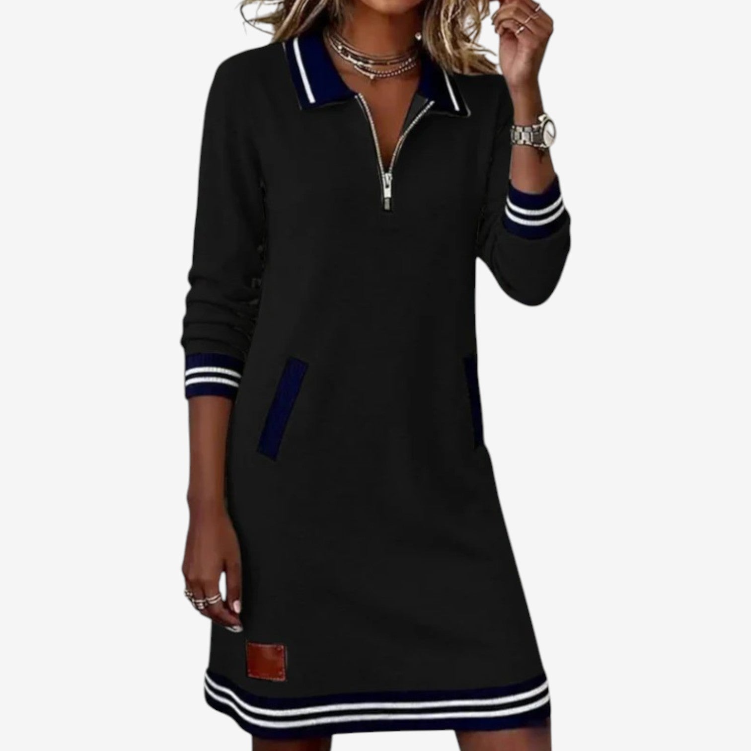 Questo raffinato abito sportivo cattura l'attenzione con le sue linee pulite, i bordi a contrasto e l'elegante scollo con zip che evoca un fascino moderno e disinvolto. Realizzato in un materiale morbido e strutturato, cade naturalmente mantenendo una silhouette raffinata che risulta al tempo stesso rilassata e composta. Il look generale trasmette una tranquilla sicurezza, fondendo una disinvoltura casual con un'eleganza sobria. La sua versatilità gli permette di passare senza problemi dalle commissioni diurne agli incontri informali con aggraziata semplicità.
