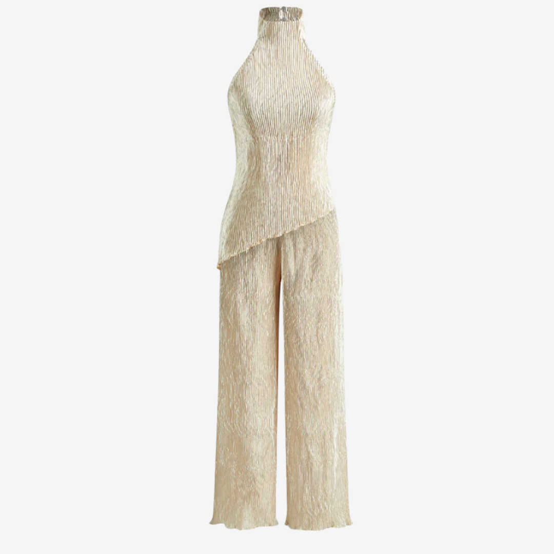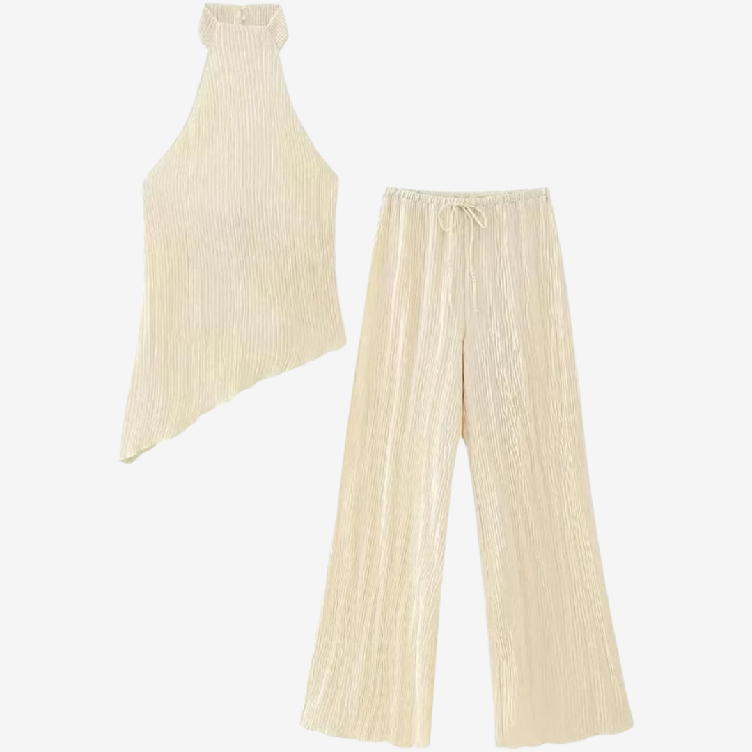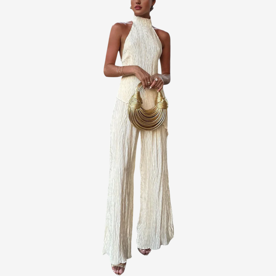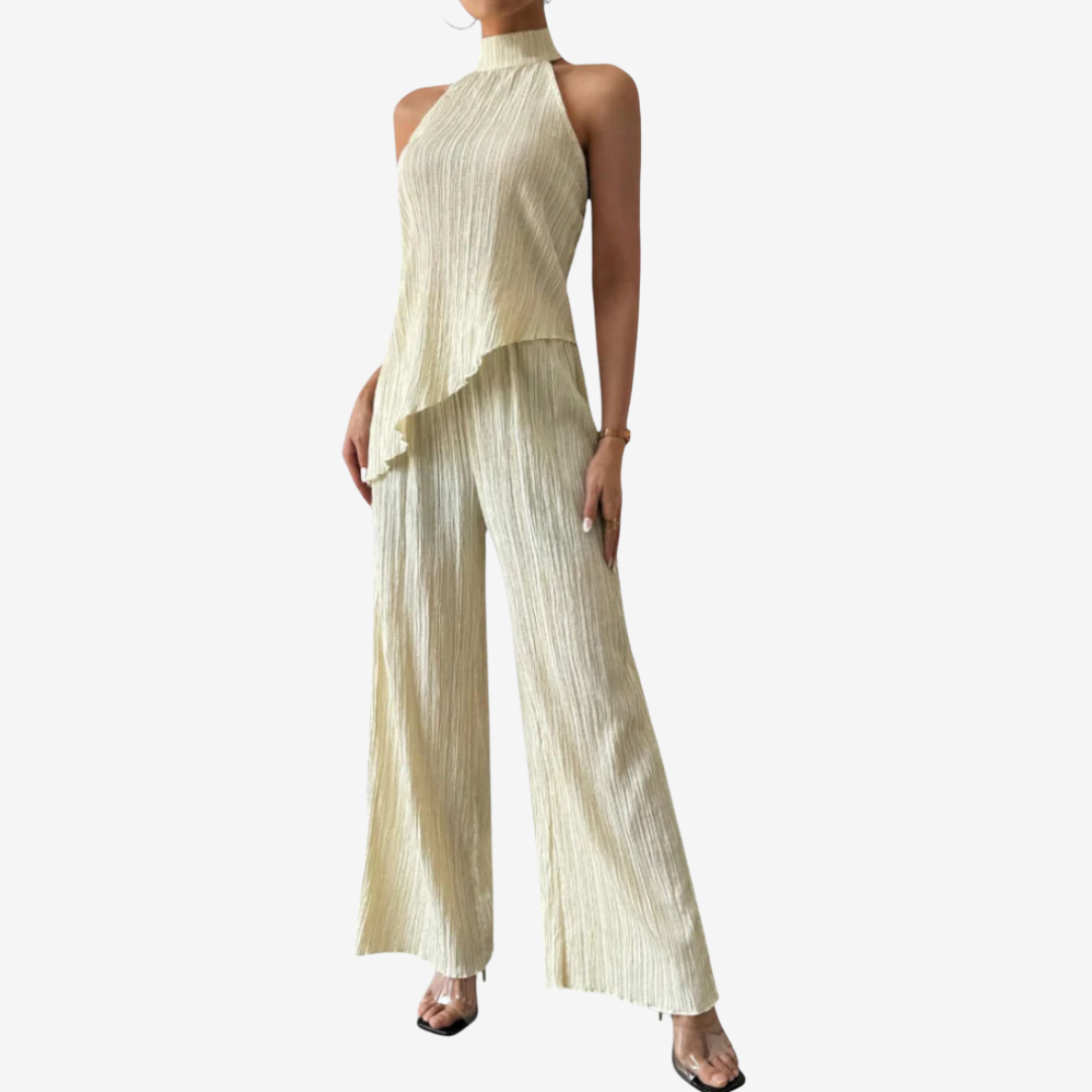 L'insieme Eléanna™ trasuda un'eleganza disinvolta. Un elegante top senza maniche con scollo all'americana abbinato a pantaloni ampi e a vita alta in un leggero tessuto crêpe color avorio crea una silhouette senza tempo. Il top presenta una scollatura drappeggiata e una schiena scoperta con delicate spalline regolabili per una vestibilità perfetta. I pantaloni presentano pieghe frontali pulite e una cintura sartoriale che accentua il punto vita allungando le gambe. Ideale per serate estive, abiti da invitata a un matrimonio o eventi raffinati, questo look bilancia con disinvoltura raffinatezza e comfort.
