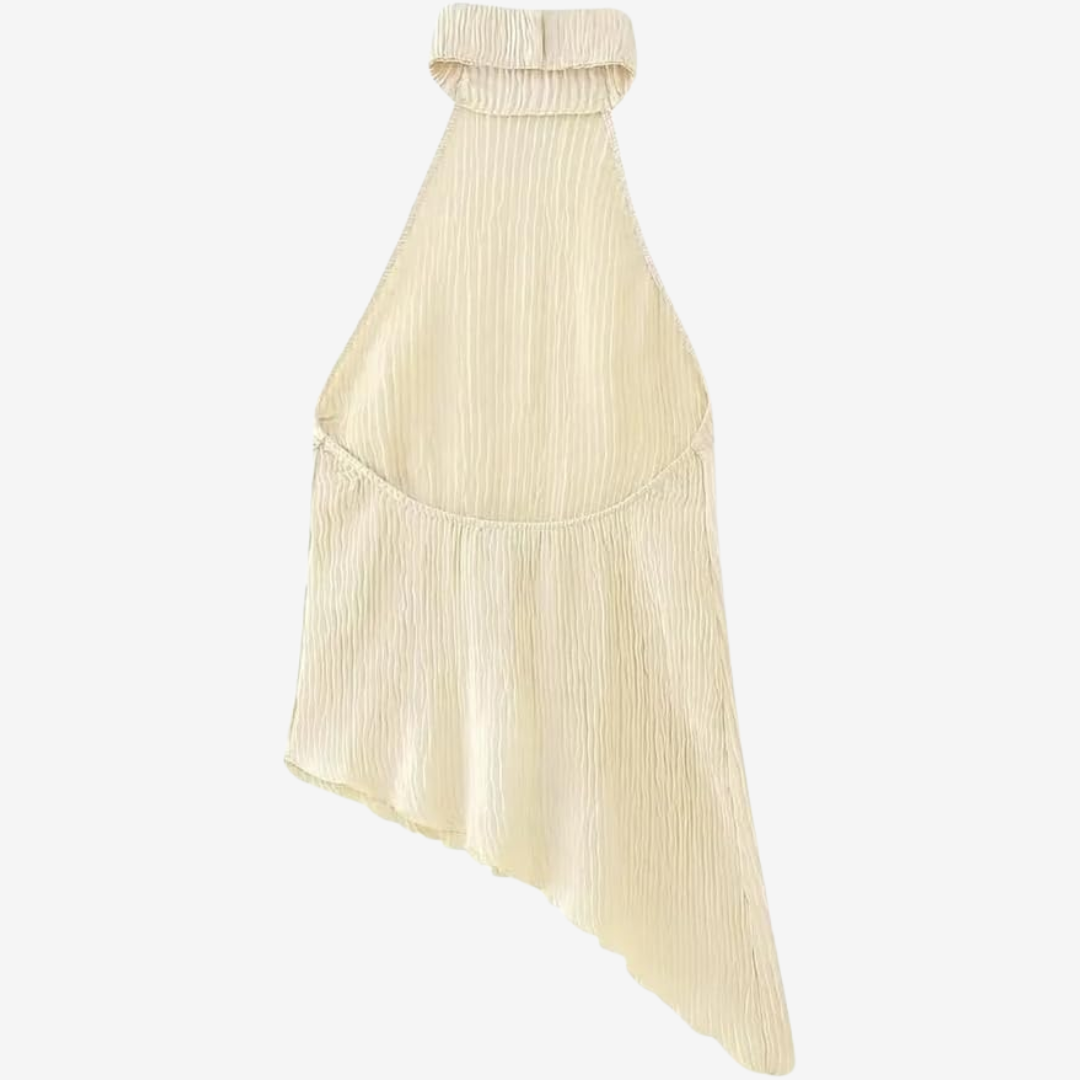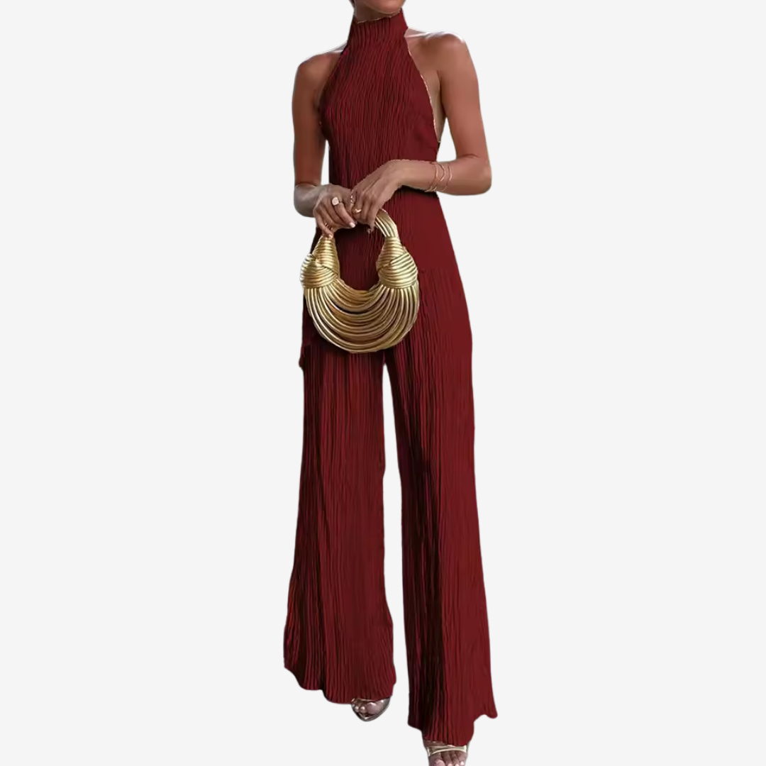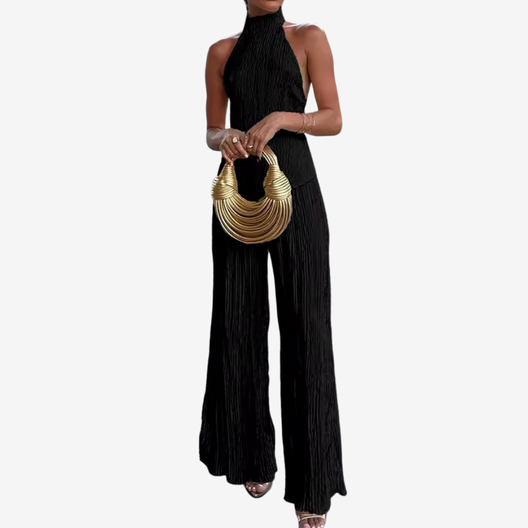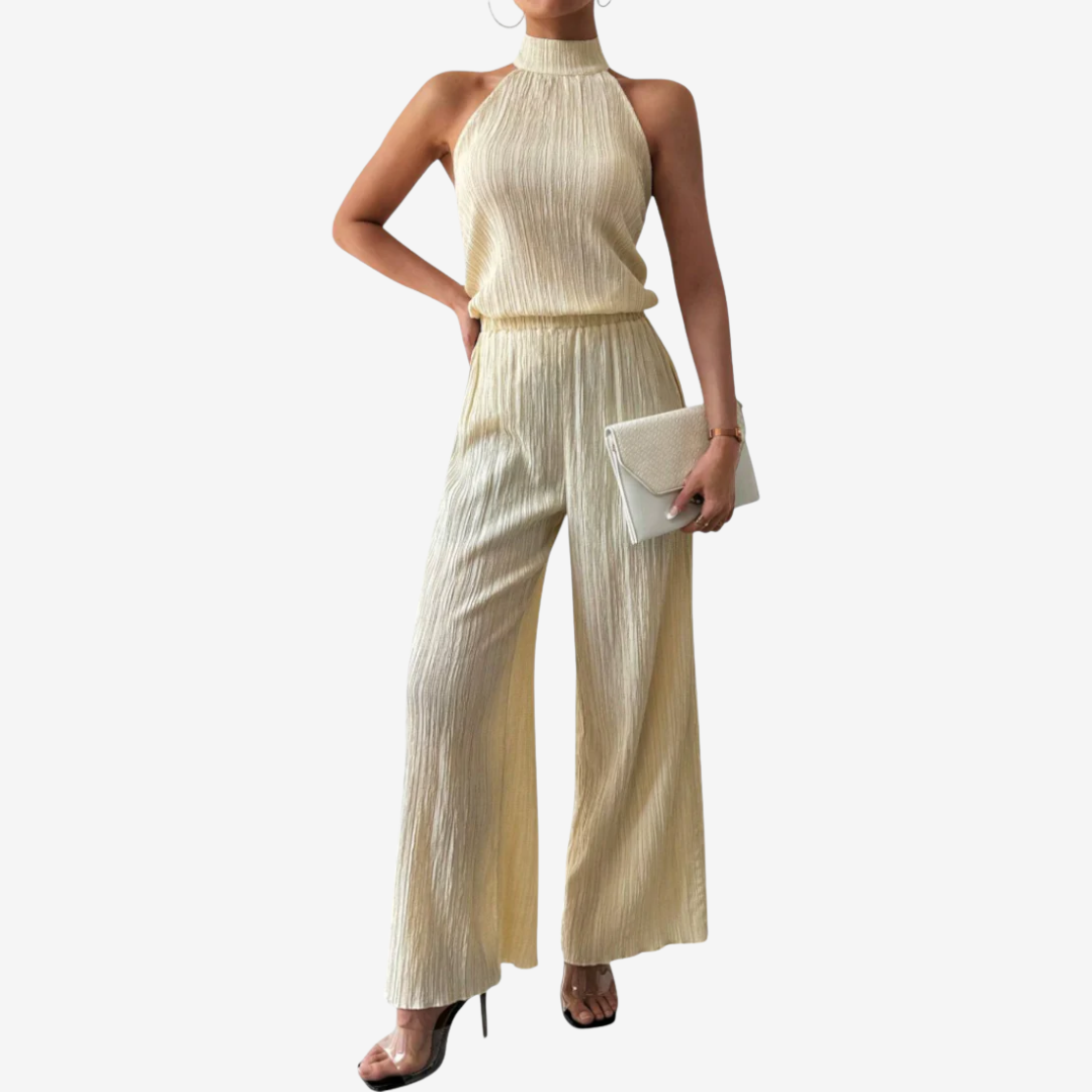 L'insieme Eléanna™ trasuda un'eleganza disinvolta. Un elegante top senza maniche con scollo all'americana abbinato a pantaloni ampi e a vita alta in un leggero tessuto crêpe color avorio crea una silhouette senza tempo. Il top presenta una scollatura drappeggiata e una schiena scoperta con delicate spalline regolabili per una vestibilità perfetta. I pantaloni presentano pieghe frontali pulite e una cintura sartoriale che accentua il punto vita allungando le gambe. Ideale per serate estive, abiti da invitata a un matrimonio o eventi raffinati, questo look bilancia con disinvoltura raffinatezza e comfort.