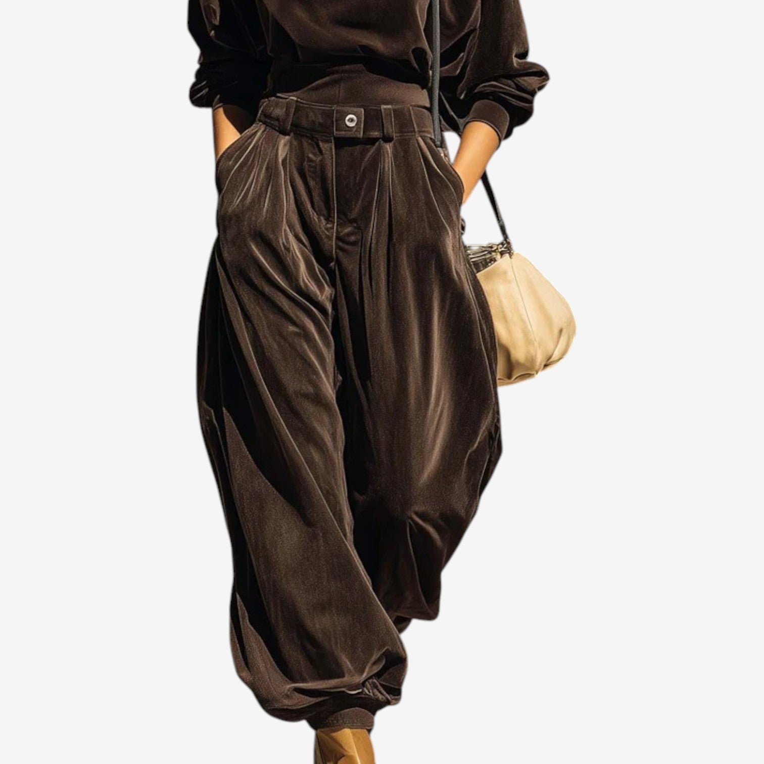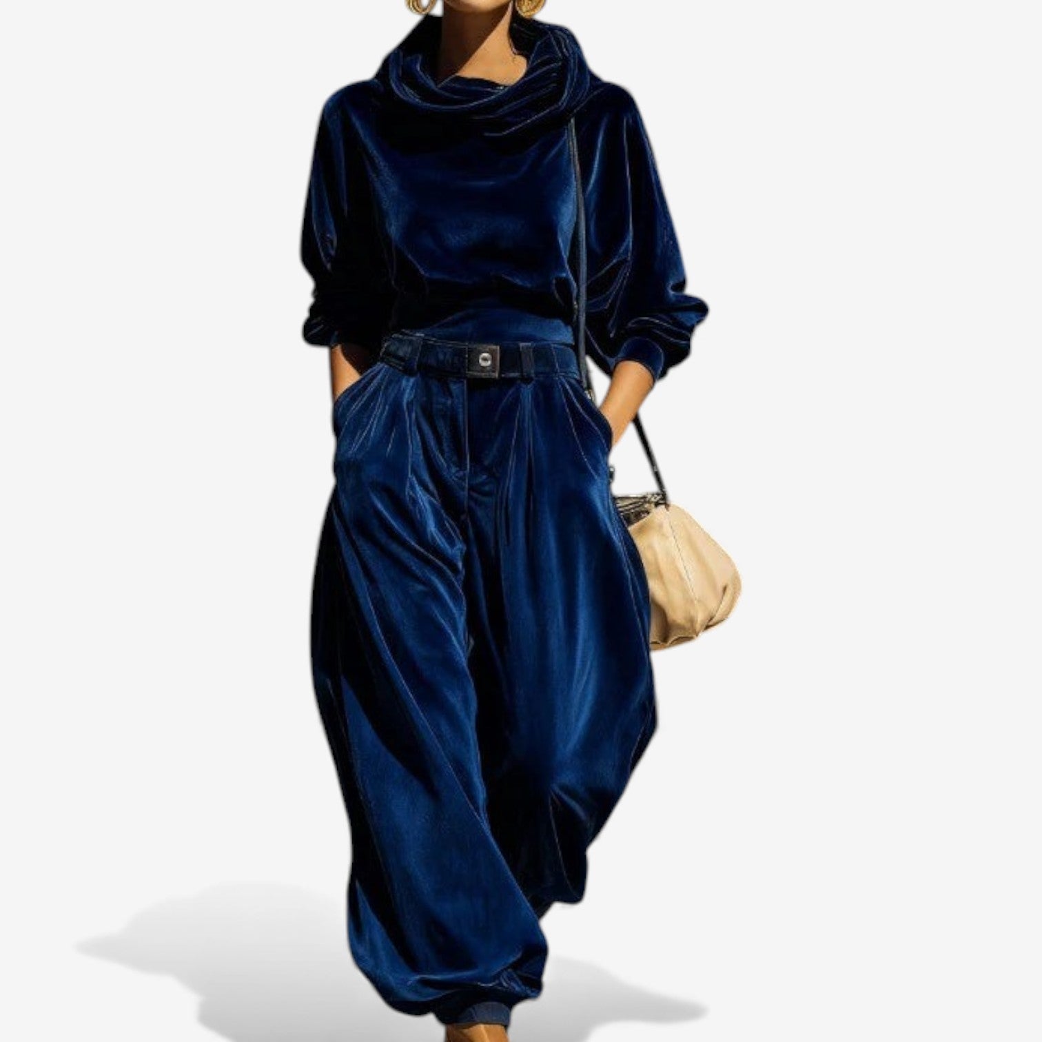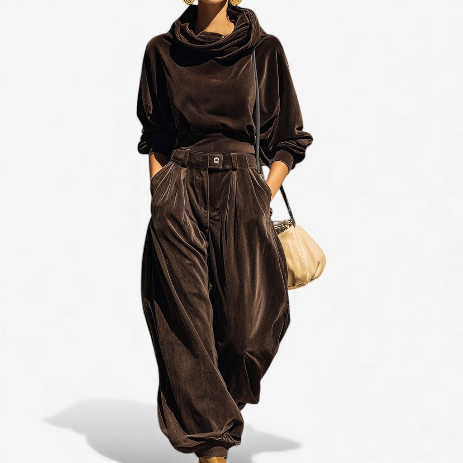 Una silhouette fluida incontra un lusso discreto in questa tuta in velluto, dove il morbido drappeggio crea un'immediata sensazione di raffinatezza. Il materiale scorre naturalmente sul corpo, offrendo una vestibilità rilassata ma strutturata, moderna e senza tempo. Ogni movimento rivela un'eleganza discreta, che evoca sicurezza senza eccessi. Perfetta per passare con disinvoltura dalla raffinatezza del giorno al fascino della sera.