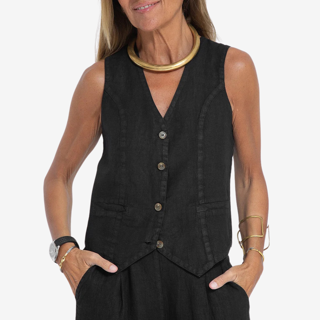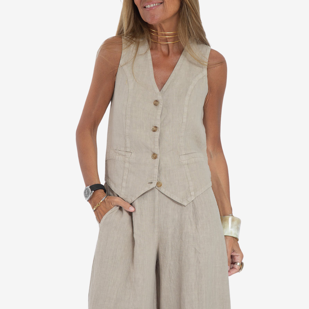 Il completo Melusine™ è la definizione di eleganza disinvolta. Caratterizzato da un gilet senza maniche con scollo a V strutturato e chiusura con bottoni e pantaloni a vita alta e gamba larga, questo completo offre una vestibilità traspirante e rilassata, perfetta per la raffinatezza della stagione calda. Ideale per brunch, passeggiate in città o un look da ufficio fresco.