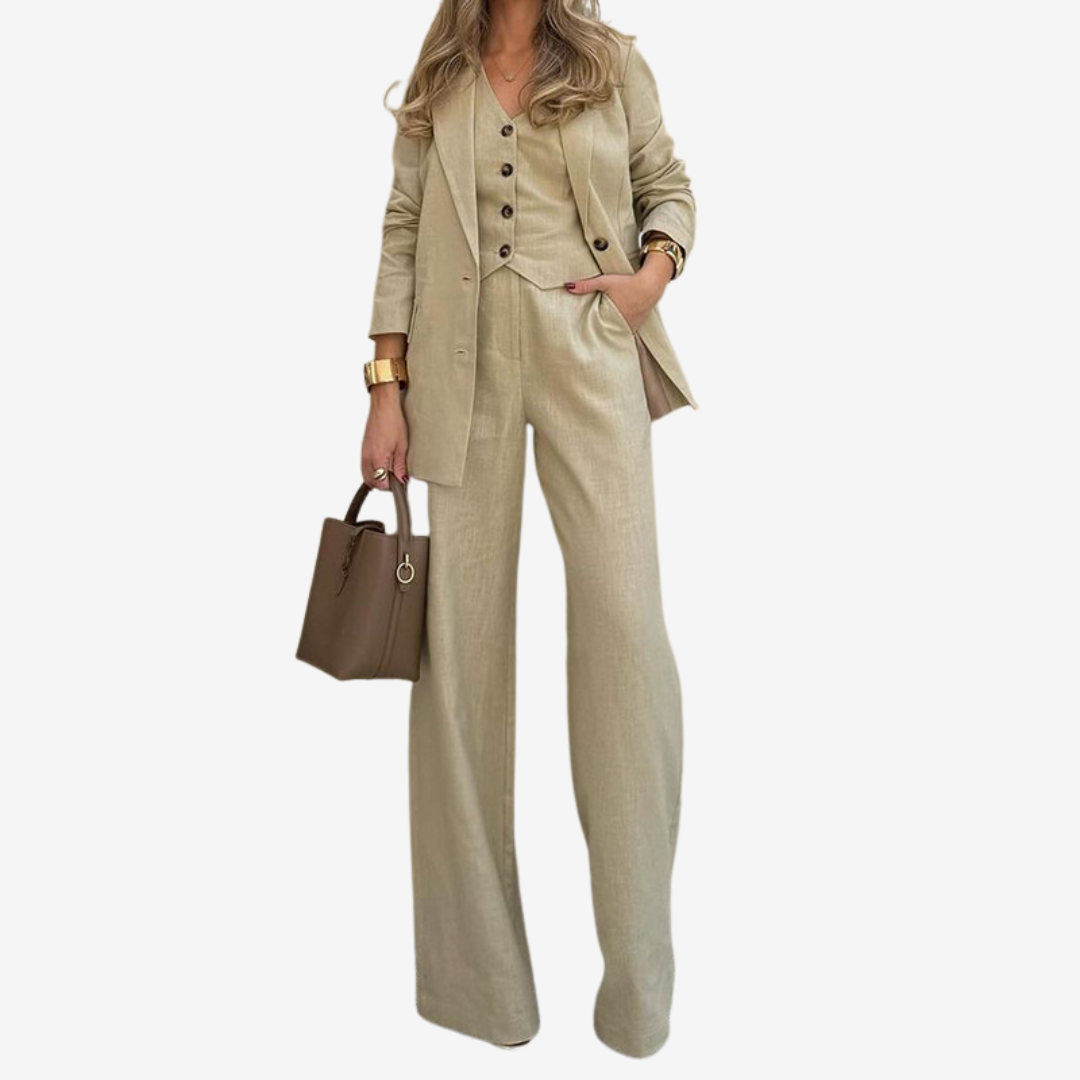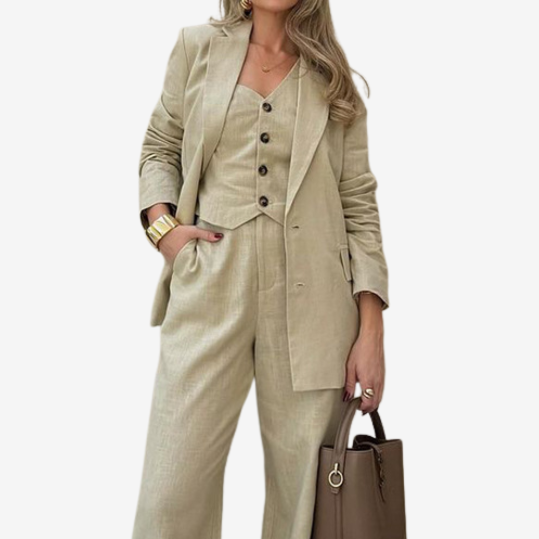 Ecco Ninette™, l'incarnazione dello chic parigino. Questo completo da 3 pezzi combina un elegante blazer sartoriale, un gilet abbottonato e pantaloni a vita alta a gamba larga. Le delicate tonalità del beige ne esaltano lo stile senza tempo, mentre il tessuto leggero cade con disinvoltura per un tocco di sofisticatezza rilassata. Versatile per riunioni di lavoro, brunch eleganti o passeggiate in città, questo tailleur si adatta alla tua giornata: basta cambiare scarpe e accessori.
