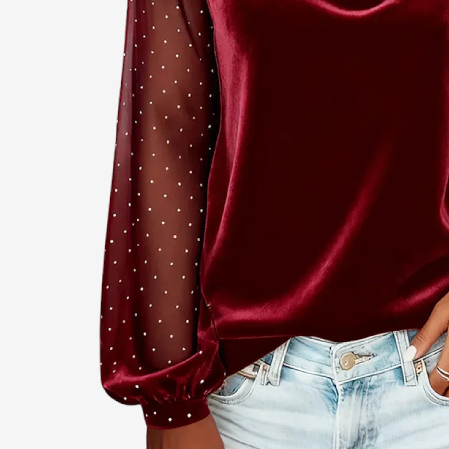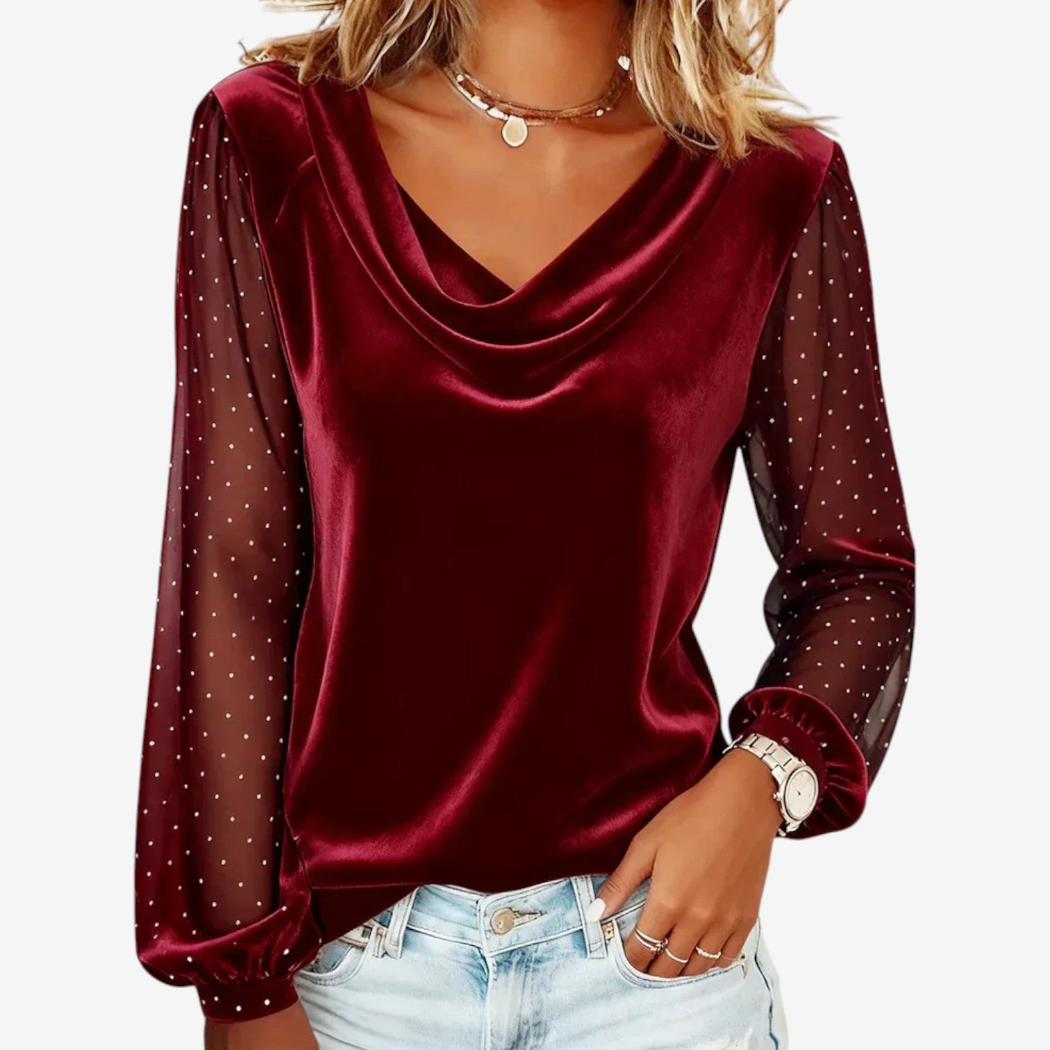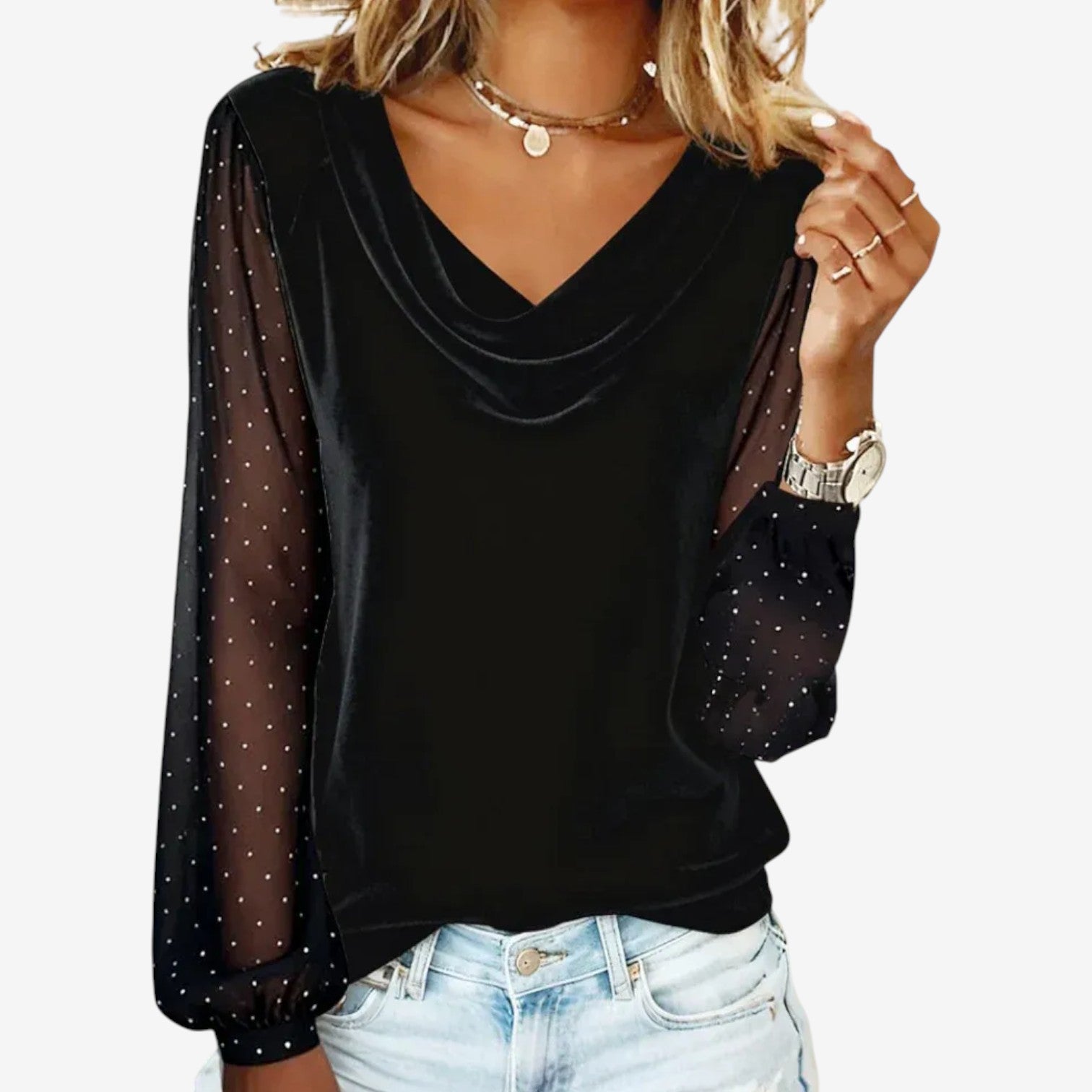Una scollatura morbidamente drappeggiata cattura l'attenzione con la sua finitura raffinata e luminosa e le delicate maniche a contrasto. Il tessuto leggero scorre delicatamente sulla silhouette, mentre le maniche trasparenti a pois aggiungono consistenza e una sobria raffinatezza. L'equilibrio tra fluidità e dettagli crea una presenza femminile e aggraziata, naturalmente raffinata. La sua eleganza disinvolta si adatta perfettamente ai momenti rilassati del giorno e a uno stile serale raffinato.